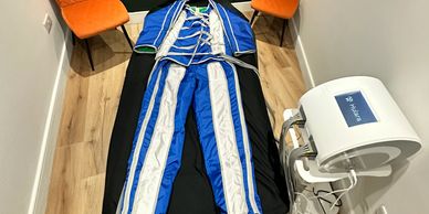The Pressotherapy machine inflates 24 air bags that compress and decompress the arms, legs and abdomen. The body suit massages the entire body.